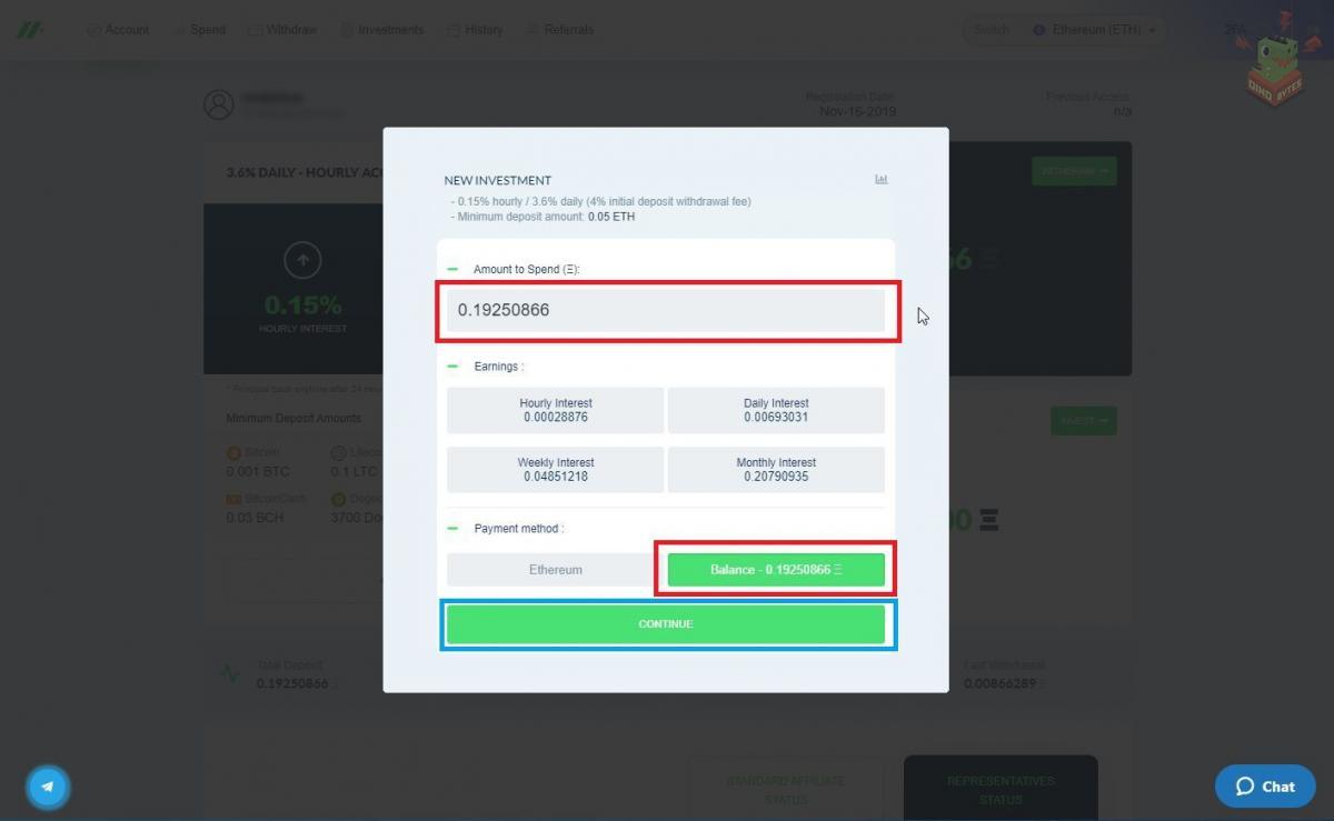 8 - Pilih [ balance ] dan masukkan kesemua nilai yg anda ingin invest ke plan baru ( disini anda boleh lihat dahulu berapa nilai yg akan anda terima setiap jam / setiap hari / setiap minggu dan setiap bulan ) dan tekan pada button [ continue ]
